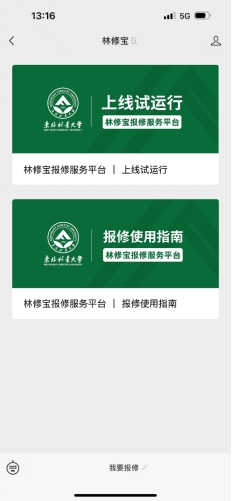 2.关注成功后,可查看公众号内提供的“报修服务平台使用指南”,或直接打开本通知附件《“林修宝”报修服务平台使用指南》,按使用指南进行身份认证后,即可正常使用。