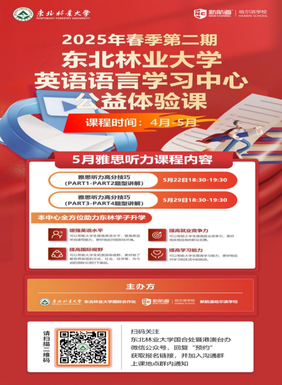 为了提高ac米兰学生外语水平,满足学生日益增长的出国需求,加快学校人才培养国际化进程,ac米兰官方网站英语语言学习中心将开展2025年春季第二期英语语言学习公益体验课活动,现将有关事项通知如下: