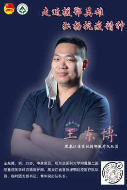 王东博,男,28岁,中共党员,哈尔滨医科大学附属第二医院重症医学科四病房护师,黑龙江省首批援鄂抗疫医疗队队员,临时团支部书记,青年突击队队长。大年初三,他毅然告别家人,随其他136名队友逆行奔赴武汉,打针换药,患者的心理护理,生活护理,安全护理,他一一克服了困难,随队圆满完成了抗疫救援任务。他作为医疗队的临时团支部书记和青年突击队队长,带领大家在这场没有硝烟的战斗中,充分发挥了青年医护的生力军和突击队作用,激励和发扬了团员青年在抗疫工作的青春力量,为武汉、为家乡、为祖国交上了一份满意的答卷,用实际行动诠释证明了作为一名临床护士,一名“90”后护士的责任,使命和担当。