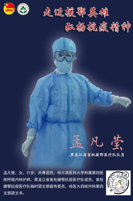 孟凡莹,女,31岁,共青团员,哈尔滨医科大学附属第四医院呼吸内科护师,黑龙江省首批援鄂抗疫医疗队成员,首批援鄂抗疫医疗队临时团支部宣传委员,哈医大四院内科第四支部团支书。她支援的是武汉协和医院,西院五楼病房里重症患者云集,作为医疗队重症护理组的一员,她除了每天面对着巨大的挑战和高强度地工作,在治病救人的忙碌之余,还尽可能地照顾患者的心理状态,在休息的间隙,爱好绘画的她还利用手中的画笔记录了医疗队队员在武汉抗疫的点滴,这一幕动人的场景也被央视的焦点访谈报道,她也被称为医疗队的“灵魂画手”。