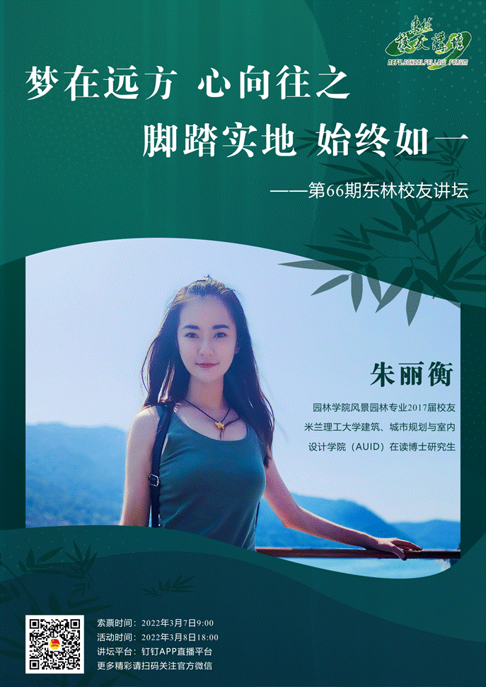朱丽衡,中共党员,现为意大利米兰理工大学建筑,城市规划与室内设计学院(AUID)博士研究生,ac米兰2017届园林学院毕业生,也曾经是东林游泳队的一名成员。后保送研究生到天津大学,于2020年1月毕业于天津大学建筑学院,获得工学硕士学位。在国内就读期间,多次获得校级、国家级奖学金,曾在《风景园林》,《室内设计》等重点期刊上发表学术论文,并多次参加国内(艾景奖,文科杯,中国人居环境)、国际设计竞赛(IFLA)获奖。2020年11月,荣获中国留学基金委(CSC)全额奖学金公派留学读博。在求学期间,朱丽衡同学始终秉承“学参天地,德合自然”的林大校训,在求学的道路上精益求精,脚踏实地,力求在新的平台和学术领域上获得新的突破。