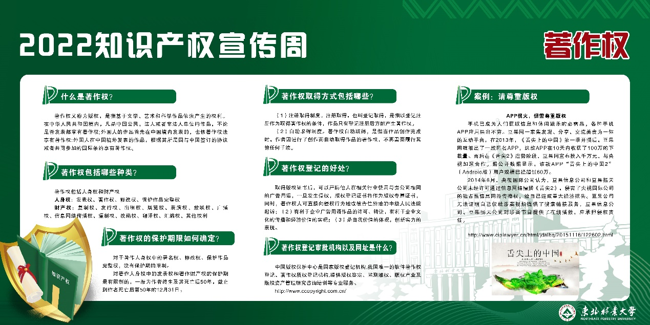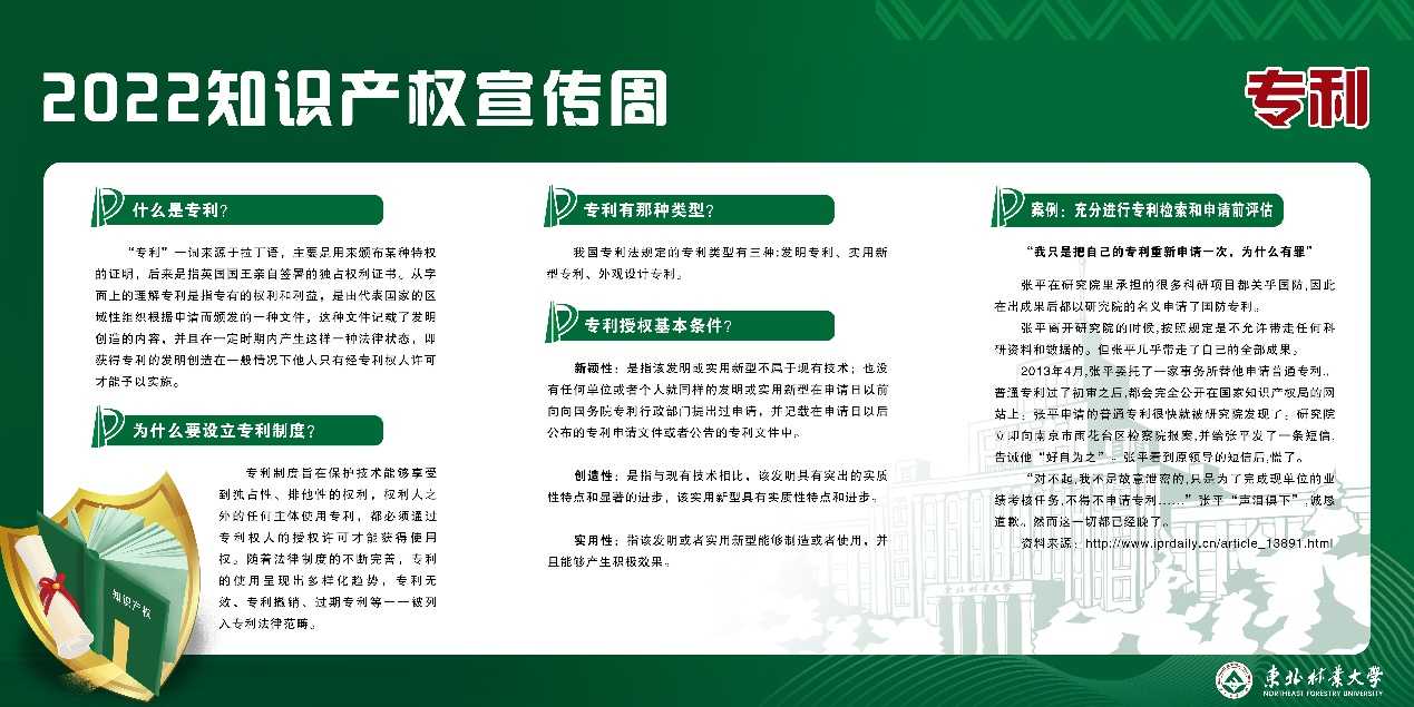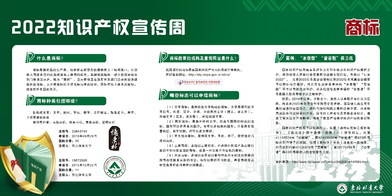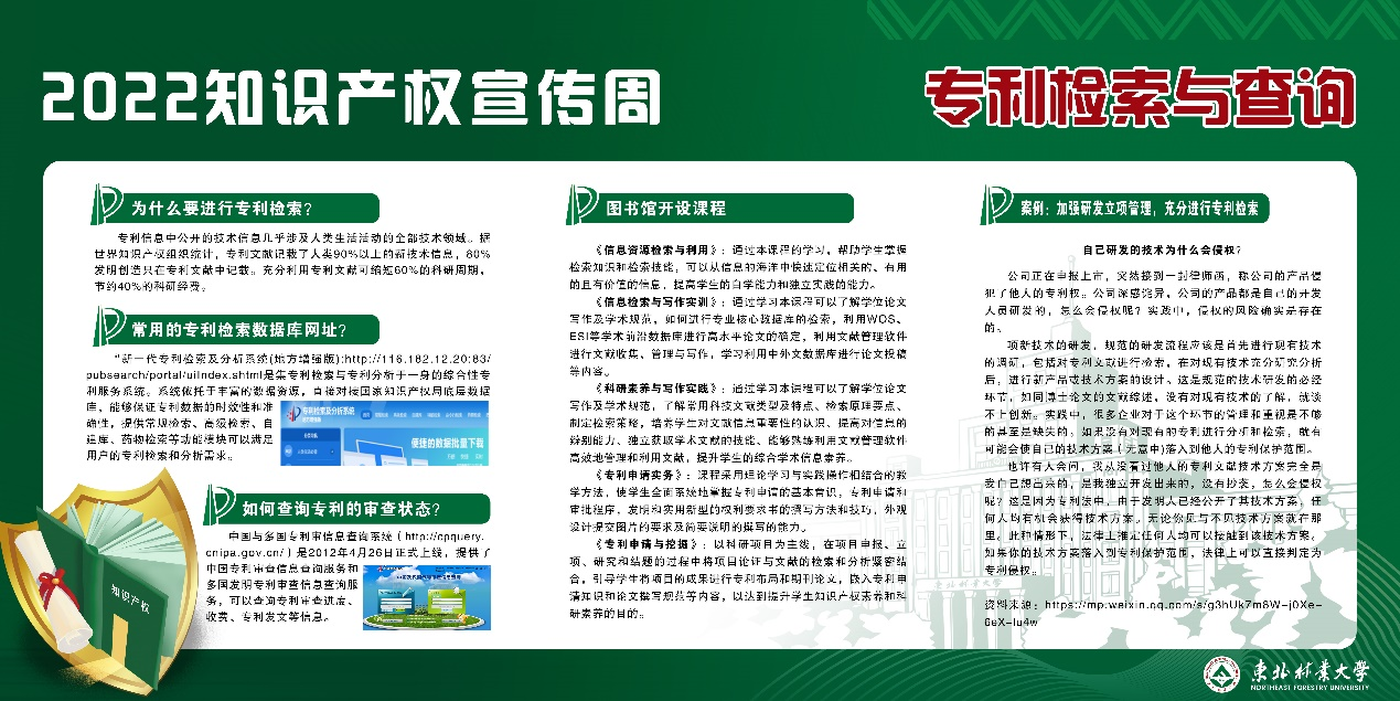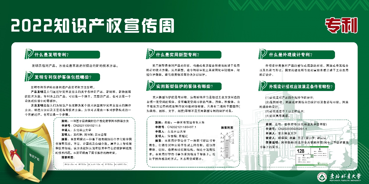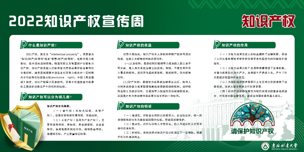 知识产权线上宣传,围绕着2022年世界知识产权日和全国知识产权宣传周的主题,共展出11块知识产权相关知识展板,包括知识产权日科普、知识产权系列知识简介、专利检索与查询方法、专利审查途径等4个方面内容。通过线上展示宣传,提高学校师生知识产权意识,营造知识产权保护氛围。