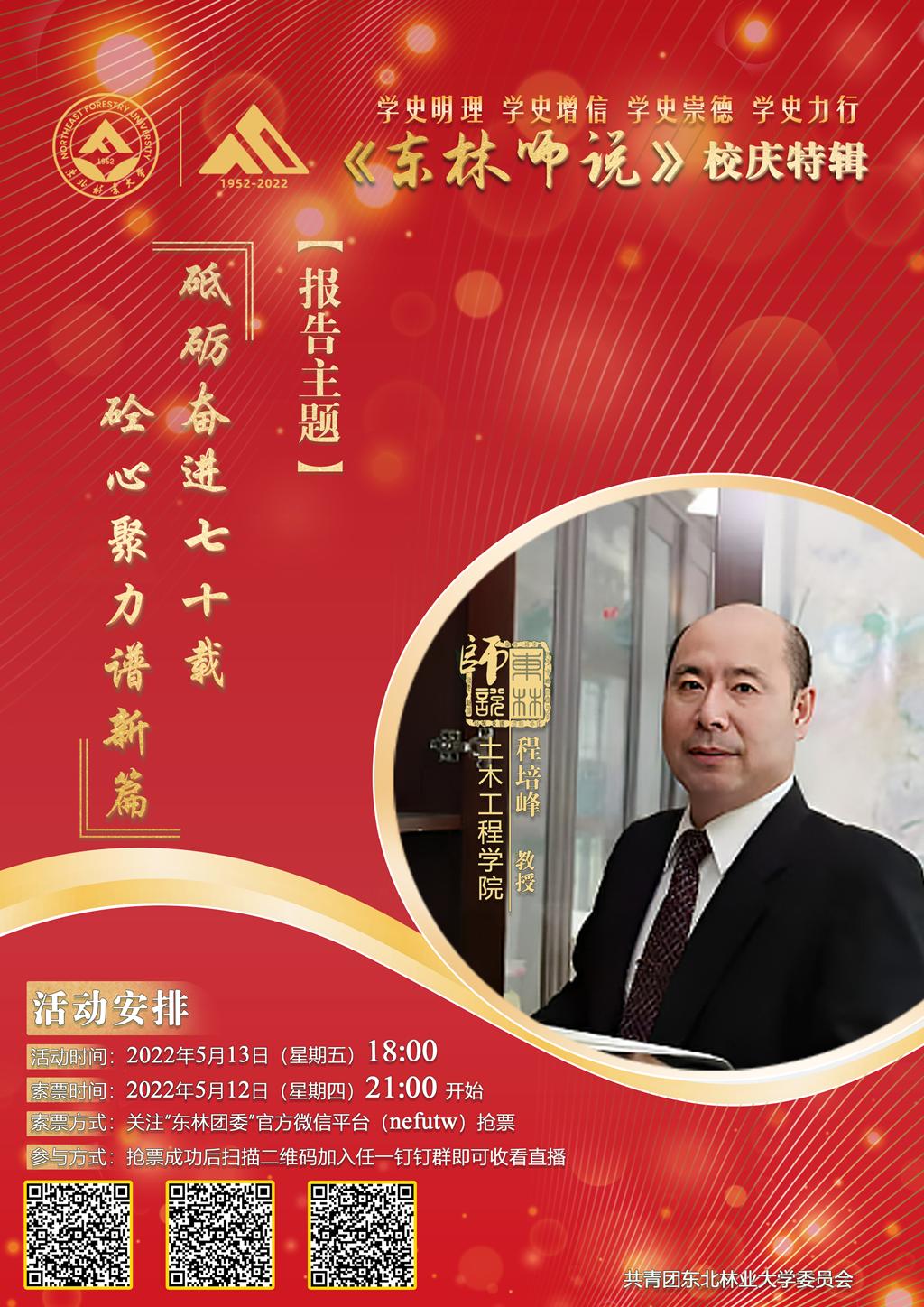程培峰教授将结合自身工作、学习经历,和师生们分享在学校70年发展历程中,土木工程学院的发展历史、人才培养方案、特色文化等,向广大师生校友讲述“育土木人、塑土木魂、聚土木情、兴土木业”土木精神的深刻内涵,介绍建院以来师生们“砼”心协力所创造的办学成就和育人成果,描绘土木工程学院在新的历史起点上面临的发展形势和规划目标,激励广大土木师生校友用实际行动为学校70周年华诞献礼!