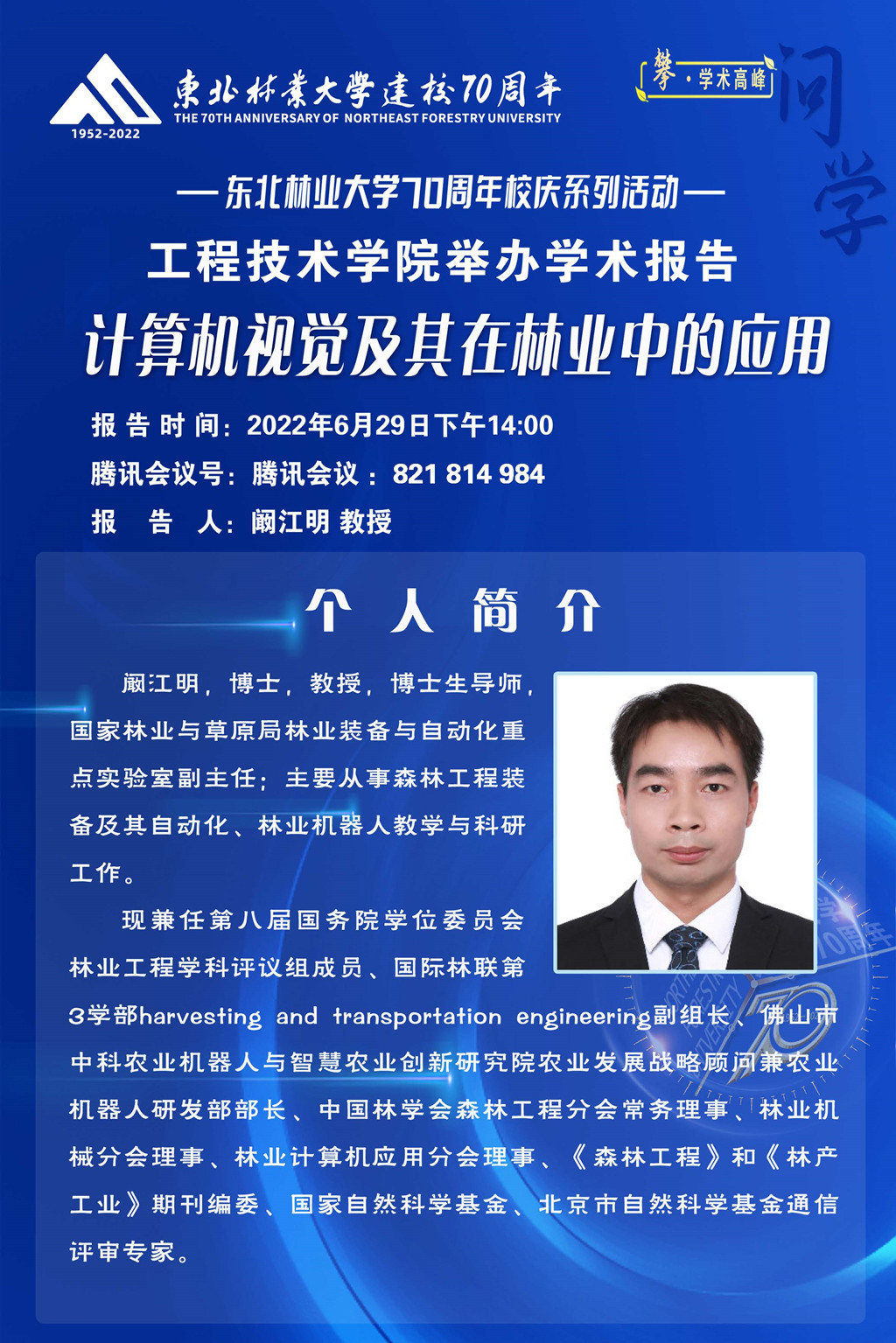 阚江明,博士,教授,博士生导师,国家林业与草原局林业装备与自动化重点实验室副主任;主要从事森林工程装备及其自动化、林业机器人教学与科研工作。