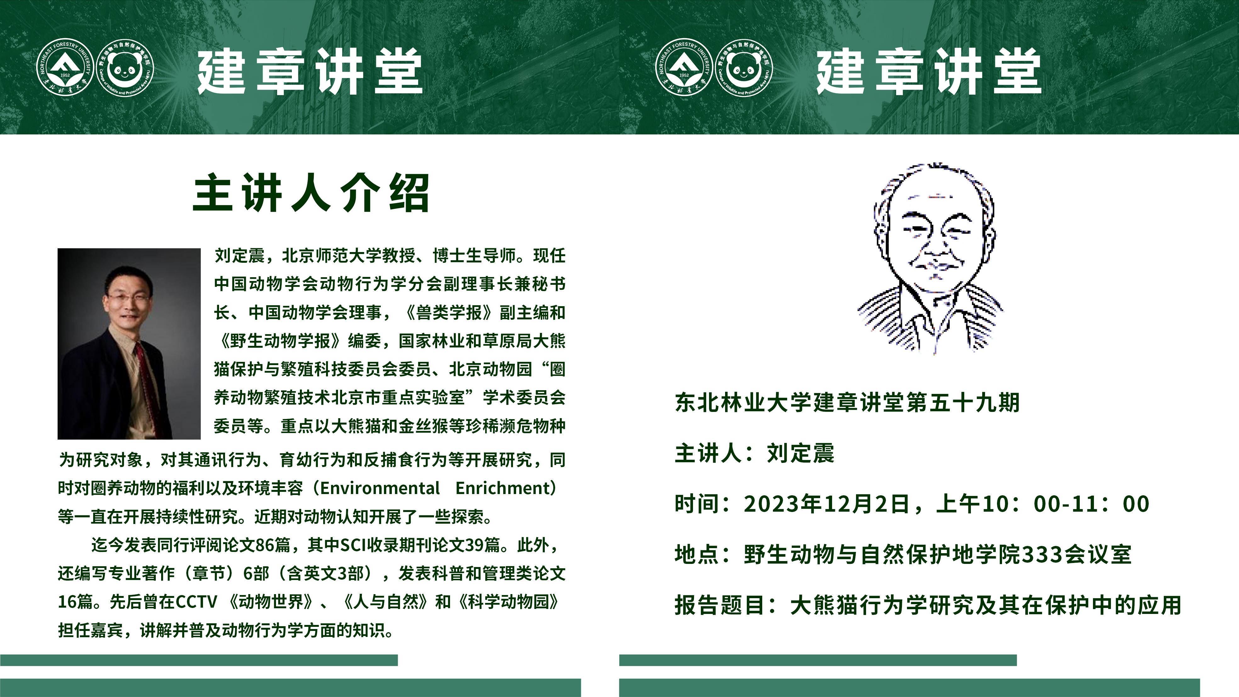 刘定震,北京师范大学教授、博士生导师。现任中国动物学会动物行为学分会副理事长兼秘书长、中国动物学会理事,《兽类学报》副主编和《野生动物学报》编委,国家林业和草原局大熊猫保护与繁殖科技委员会委员、北京动物园“圈养动物繁殖技术北京市重点实验室”学术委员会委员等。重点以大熊猫和金丝猴等珍稀濒危物种为研究对象,对其通讯行为、育幼行为和反捕食行为等开展研究,同时对圈养动物的福利以及环境丰容(Environmental Enrichment)等一直在开展持续性研究。近期对动物认知开展了一些探索。