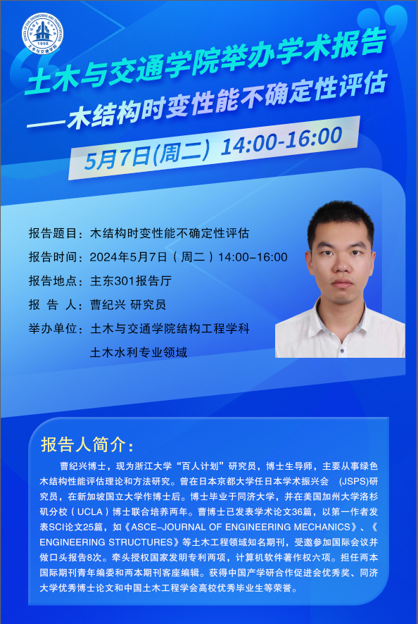 曹纪兴博士,现为浙江大学“百人计划”研究员,博士生导师,主要从事绿色木结构性能评估理论和方法研究。曾在日本京都大学任日本学术振兴会(JSPS)研究员,在新加坡国立大学作博士后。博士毕业于同济大学,并在美国加州大学洛杉矶分校(UCLA)博士联合培养两年。曹博士已发表学术论文36篇,以第一作者发表SCI论文25篇,如《ASCE-Journal of Engineering Mechanics》、《Engineering Structures》等土木工程领域知名期刊,受邀参加国际会议并做口头报告8次。牵头授权国家发明专利两项,计算机软件著作权六项。担任两本国际期刊青年编委和两本期刊客座编辑。获得中国产学研合作促进会优秀奖、同济大学优秀博士论文和中国土木工程学会高校优秀毕业生等荣誉。