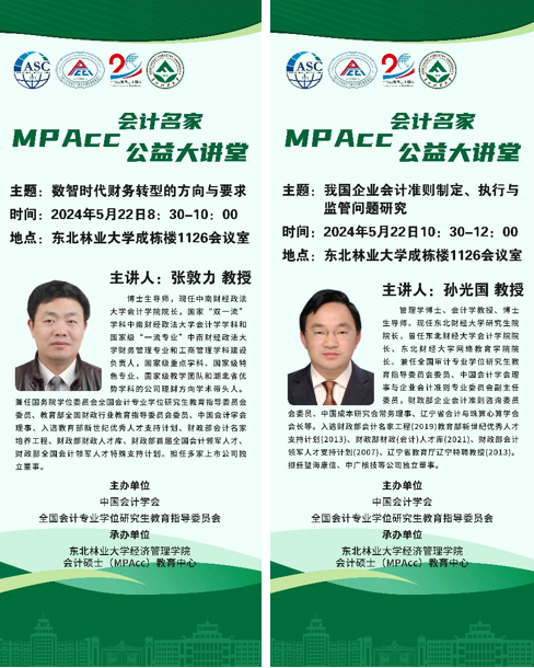 为了充分发挥会计名家在引领和推动我国会计教育持续繁荣发展中的重要作用,为MPAcc学员提供更多与会计知名学者学习、交流的机会,提升MPAcc学员的综合素质,由中国会计学会、全国会计专业学位研究生教育指导委员会(以下简称会计教指委)联合发起了MPAcc会计名家公益大讲堂(以下简称公益大讲堂)活动,本次活动由我院及会计硕士(MPAcc)教育中心承办,讲座安排如下表:
