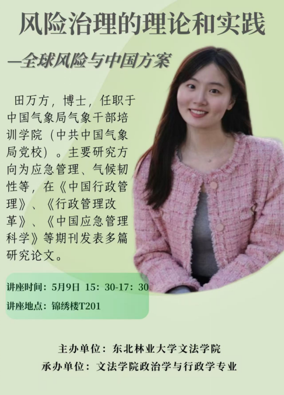 讲座人简介:田万方,博士,任职于中国气象局气象干部培训学院(中共中国气象局党校)。主要研究方向为应急管理、气候韧性等,在《中国行政管理》《行政管理改革》《中国应急管理科学》等期刊发表多篇研究论文。