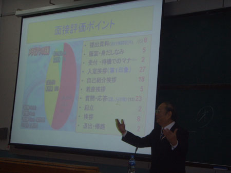 讲座以日企面试必胜对策为核心,从商务礼仪和面试要点两个方面展开。首先山口隆道先生通过DVD与大家一起学习了商务礼仪,并亲自进行示范指导。然后他针对学生学习实践中的弱点提出了一些解决对策。