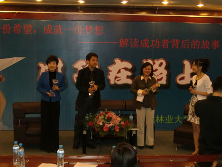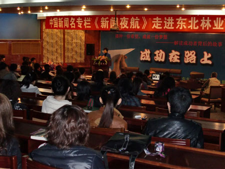 2006年硕士毕业后进入栏目组的孙光磊主编结合自己感人至深的《小世达的故事》、和林业大学息息相关的《光磊大山行》等五个新闻作品,讲述了他在新闻采访过程中经历的难忘故事,与大家分享了在节目采访、制作、跟踪报道等过程中的收获与感动。修琳主播从于全和陈迎雪两个人物诠释了“你的泪水是我的牵挂、你的微笑是我的幸福”的节目理念,回忆了自己在夜航工作的8年历程,坦言8年时光让她不断成长成熟,经历了众多新闻背后感人的故事,令同学们感动于她的真诚与执着,当她谈到自己更加留恋这个舞台,愿意不断沉淀、完善自己,更好地给观众讲述夜航故事时,同学们又看到了一位谦虚而且努力的主播。有着11年新闻采编一线从业经历的《新闻夜航》制片人张晓梅女士为大家讲述了《新闻夜航》作为我国最早的民生新闻栏目,十年来如何坚持“三个专业”,探索出了一条关注民生,反映民意的成功之路。
