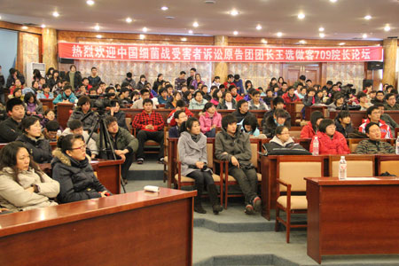 12月5日晚,由研究生会组织策划的“709院长论坛”第四十二期——“揭开在黑暗中的屠杀”在动资楼国际会议厅顺利举行。2002年感动中国人物、中国细菌战受害者诉讼原告团团长王选,侵华日军遗弃毒剂泄漏事件受害者代理律师、ac米兰校友罗立娟,毒气弹受害者李臣先生做客“709院长论坛”,为师生解读日本在华细菌战调查和对日民间索赔工作,让听众了解历史真相。