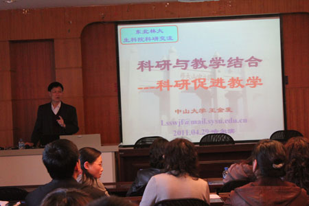2011年4月29日下午,在逸夫楼608会议室,中山大学国家级教学名师王金发教授应邀到生命科学学院讲学,为师生作了题为《研究性教学的理念与实践——感悟有生命的课堂》的报告。教务处迟德富书记、姜中珠副处长、生命学院李玉花院长、华育平书记、王晶英副院长、赵敏副院长和近百名生命科学学院、林学院、园林学院、野生动物资源学院师生参加了本次讲座。讲座由李玉花院长主持。