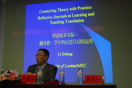 李德凤教授的讲座题目为“Connecting Theory with Practice: Reflective Journal in Learning and Teaching Translation”(理论联系实际:翻译教、学中反思日记的运用)。李德凤教授以“翻译理论研习的必要性;翻译理论运用的适时性与适度性;翻译理论学习的最佳途径”三个问题为主导,针对性地解答了学习者中普遍存在着的认为翻译理论较为抽象,与翻译实践相距甚远的疑虑;系统地介绍了Holmes对译学理论体系的划分;重点地阐释了Reiss的功能翻译理论以及其后成为功能翻译理论核心的Hans Vermeer的目的论。然后,李德凤教授通过实证详细地论述了反思日记在翻译理论和翻译实践相结合的过程中所起的重要作用,提出了学习者对翻译理论的内化过程是翻译教学中的重要环节的主张。李德凤教授特别指出:反思日记的运用为翻译课程的教授者与学习者之间开辟了一条有效的交流途径,为学习者提供了有效的理论运用参数,是一种值得推广的教学方法。最后,李德凤教授详细地回答了现场师生的提问。李德凤教授的讲座充分体现了一个著名学者的学术造诣和职业素养。李德凤教授的学术讲座获得了与会者的一致好评与衷心赞叹。