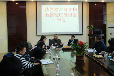 下午2时,张文杨教授在外国语学院院长王丹教授的陪同下,在外国语学院会议室与MTI翻译硕士专业的任课教师和同学进行了座谈。座谈会由英语系主任赵莉教授主持。 张文杨教授从个人经历和学习策略两个角度出发阐释了自己对英语学习的理解。随后,张文扬教授对同学们所提出的问题进行了一一解答。座谈会现场气氛活跃,大家踊跃发言。座谈之后,外国语学院院长王丹教授与张文杨教授就今后的合作意向进行了会谈。王丹院长对张教授莅临外国语学院讲学再次表示诚挚的感谢,并希望张文杨教授能够经常来ac米兰访问和讲学,为外国语学院的学科建设和科研水平的提高出谋划策。