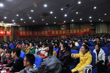 在讲座正式开始前,同学们先观看了刘老师在各大学讲座经历的视频,了解了其他大学英语学习的氛围,也见识到了疯狂英语学习者们近乎疯狂的激情。随后,刘老师通过对自己真实经历的分析,纠正了同学们过去对英语四、六级“只求一证”的错误态度,提出“练好口语,顺便过四、六级”以及“英语只有说出来才是自己的”的观点,还对考试中听力、阅读、作文等方面提出了极具建设性的建议,为同学们指出了行之高效的学习途径。