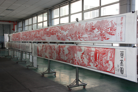 剪纸,又叫刻纸,是中华民族最古老的民间艺术之一。2006年,已被纳入国家非物质文化遗产名录。 本次展出的作品均出自林玉卿和刘英杰两位德艺双馨的剪纸艺术家之手,共展出包括《金陵十二钗》、《清明上河图》、《千古名家》、《溪山风雨图》等在内的93幅优秀剪纸书画作品。
