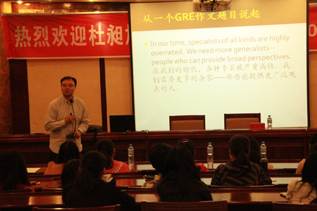 其次,针对大学到底应该做什么的问题,杜老师认为 “大学不应只教授专业知识,而应更为宽口径培养人才。”“多读书、多思考是大学生应该做的两件事,思维的勤快比行为的勤快更有意义。”他指出大多数同学都有读书规划但很少有人坚持下来,而只有当看书学习变为随时随地的习惯,才能不断进步。