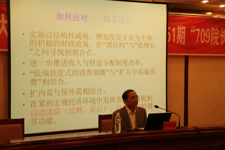 如何应对经济下滑是当前社会的热点问题,方福前教授带领同学们从三个方面对此问题进行了深入剖析。首先,方教授解释了如何协调好稳增长与调结构的关系。方教授表示,应当把“调结构”作为我国经济社会发展的中长期战略任务之一,不能把“调结构”视为短期政策目标,否则会影响结构调整的连续性和成效。接着,在谈到为什么要强调协调好“稳增长与调结构”的关系时,方教授指出经济增速下滑而经济结构在某些方面失衡加重是其主要原因,提出应将经济工作和宏观经济政策的优先次序调整为:调结构、稳增长、控物价。最后,关于应对经济下滑的具体措施,方教授表示,要实施以结构性减税、增加投资支出为主体的积极的财政政策,在“调结构”与“稳增长”之间寻找到契合点;进一步推进收入与财富分配制度改革;“低端扶贫式的消费刺激”与“扩大中高端消费”相结合;在紧的宏观经济环境中发挥市场价格机制自动清除、自我修复的调节功能。在互动提问环节,同学们就平时学习过程中和讲座中遇到的问题向方教授请教,方教授细致全面的回答获得了阵阵掌声,使大家受益匪浅。
