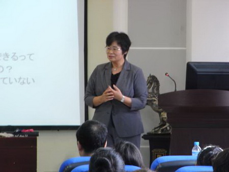 爱媛大学林智子先生的讲座深入浅出,联系实际,方法实用。在讲座中林智子先生为学生提供了多种可以快速提高日语运用能力的方法。林智子先生同时为学生们提供了日语运用能力评价标准。该评价标准将日语运用能力划分为四级即初级、中级、高级、超级,每一级又划分为四个观察点。这种评价方法内容详实,简单易行,评价准确,为学生评价自己的日语运用能力提供了一个切实可行的方法。
