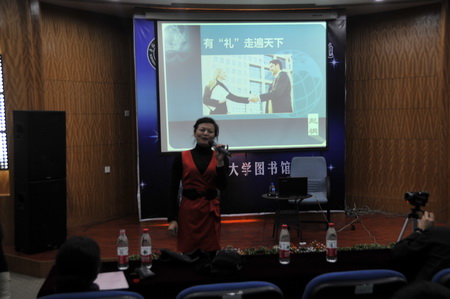 这次旨在为处于人生学习和成长重要阶段的大学生传授基本的礼仪知识,让大家学会沟通,学会交往进而促进校园文明建设的讲座,是图书馆举办百家对话讲座活动以来首次进行的校园礼仪讲座。活动不仅丰富了图书馆“喜迎新生书馆畅游”主题系列活动的内容,也为“百家对话”讲座增添了新意。(赵一霖)