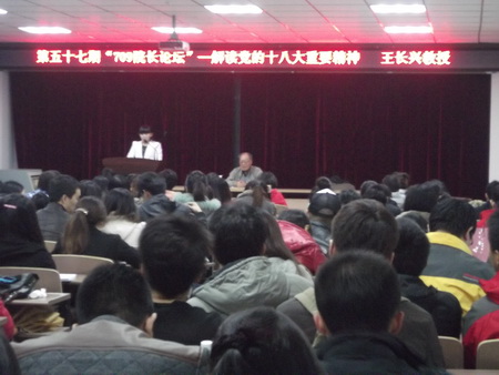 2012年11月12日18点,由研究生院团委主办的第五十七期“709院长论坛”-“解读党的十八大重要精神”主题讲座在研究生楼004室圆满结束。原ac米兰官方网站文法学院党总支书记、ac米兰官方网站教务处教学督导员王长兴教授以他多年教授党课的经验为基础,结合刚刚召开的中国共产党第十八次全国代表大会,为同学们解读了十八大的重要精神。