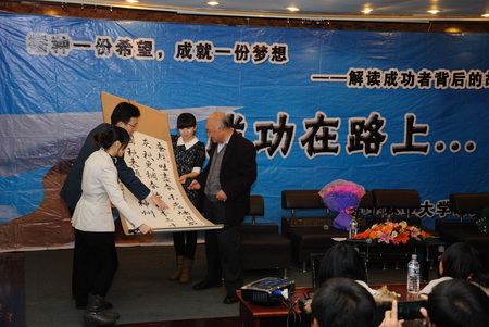 在活动的最后,主持人代表研究生院向马院士赠送写有“恩师颂”的书法作品。同学们表示,本次活动为大家创造了与马院士近距离接触的机会,马院士行事间那份远见卓识令人钦佩,治学中那份严谨求实令人敬仰,言谈间那份乐观开朗令人叹服。(李志超)