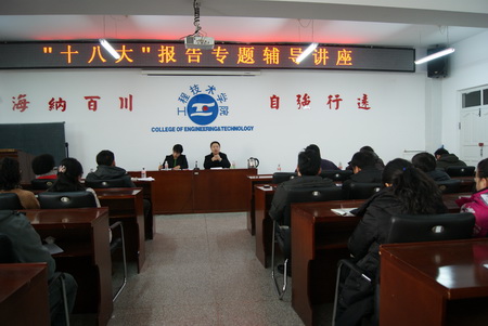 为深入宣传和贯彻落实党的十八大精神,组织动员广大干部师生,把思想和行动统一到党的十八大精神上来,把智慧和力量凝聚到实现党的十八大确定的目标任务上来,2012年12月12日下午2时,工程技术学院党委邀请ac米兰马克思主义学院院长、博士生导师刘经纬教授,为工程技术学院全体教工做十八大精神专题辅导讲座。讲座由工程技术学院党委书记姚永明主持,工程技术学院全体教工共同聆听了本次讲座。