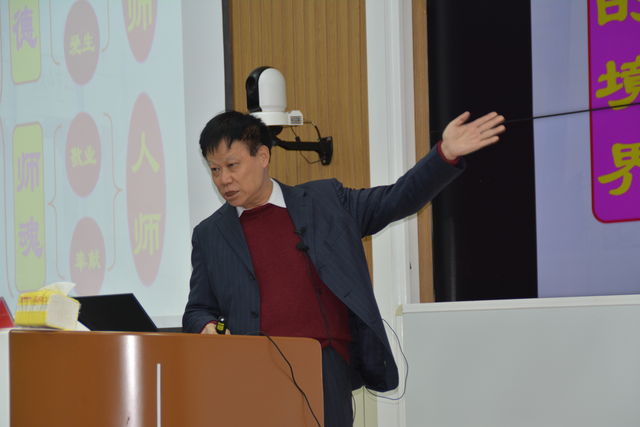 王金发教授结合自身教学经历和感悟,用大量鲜活的事例和生动的故事,展示了一位老教师“站好讲台,立德树人”的风采,并深深感染了在场教师,也为广大教师成为德艺双馨的好教师树立了榜样。